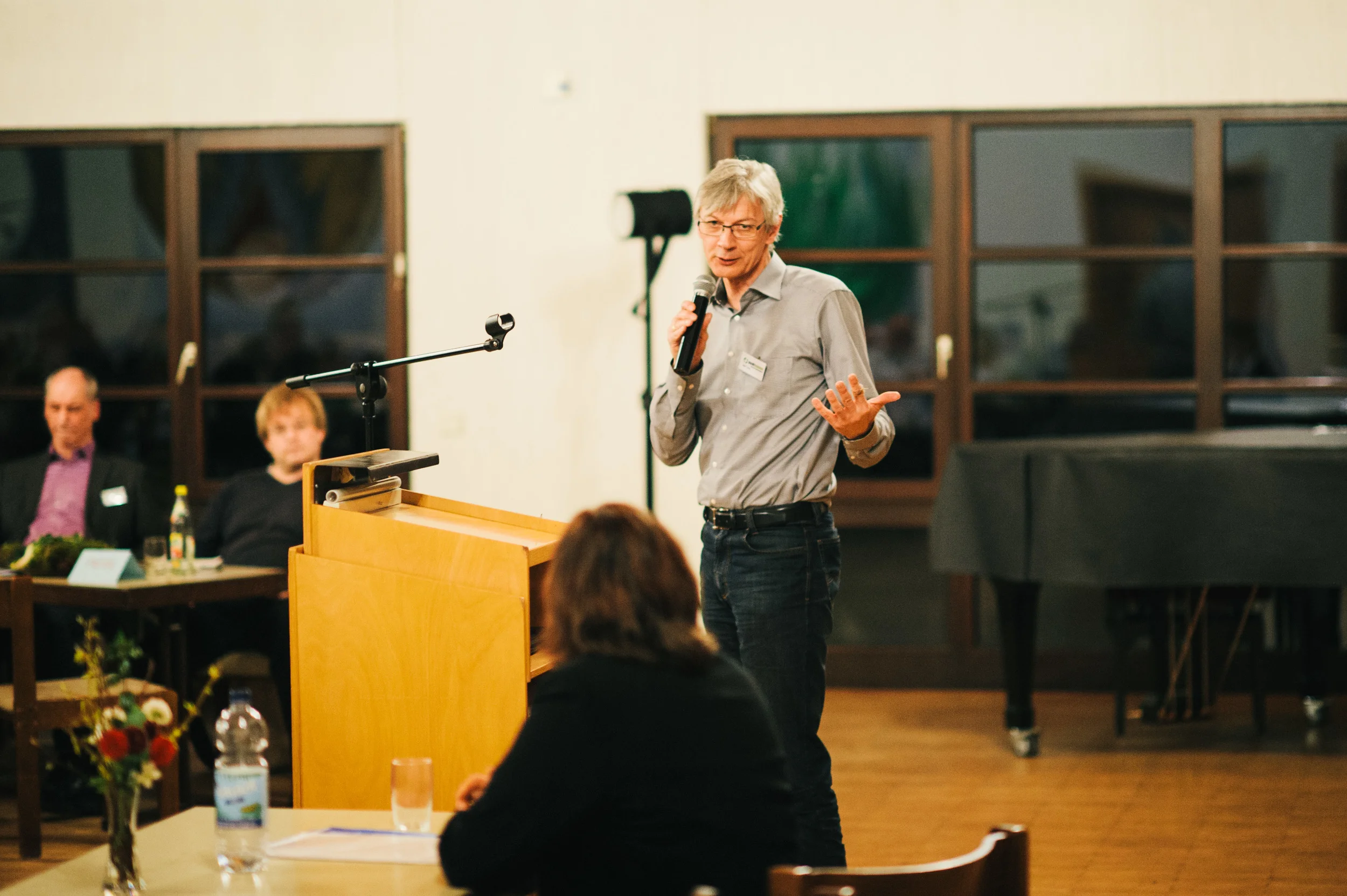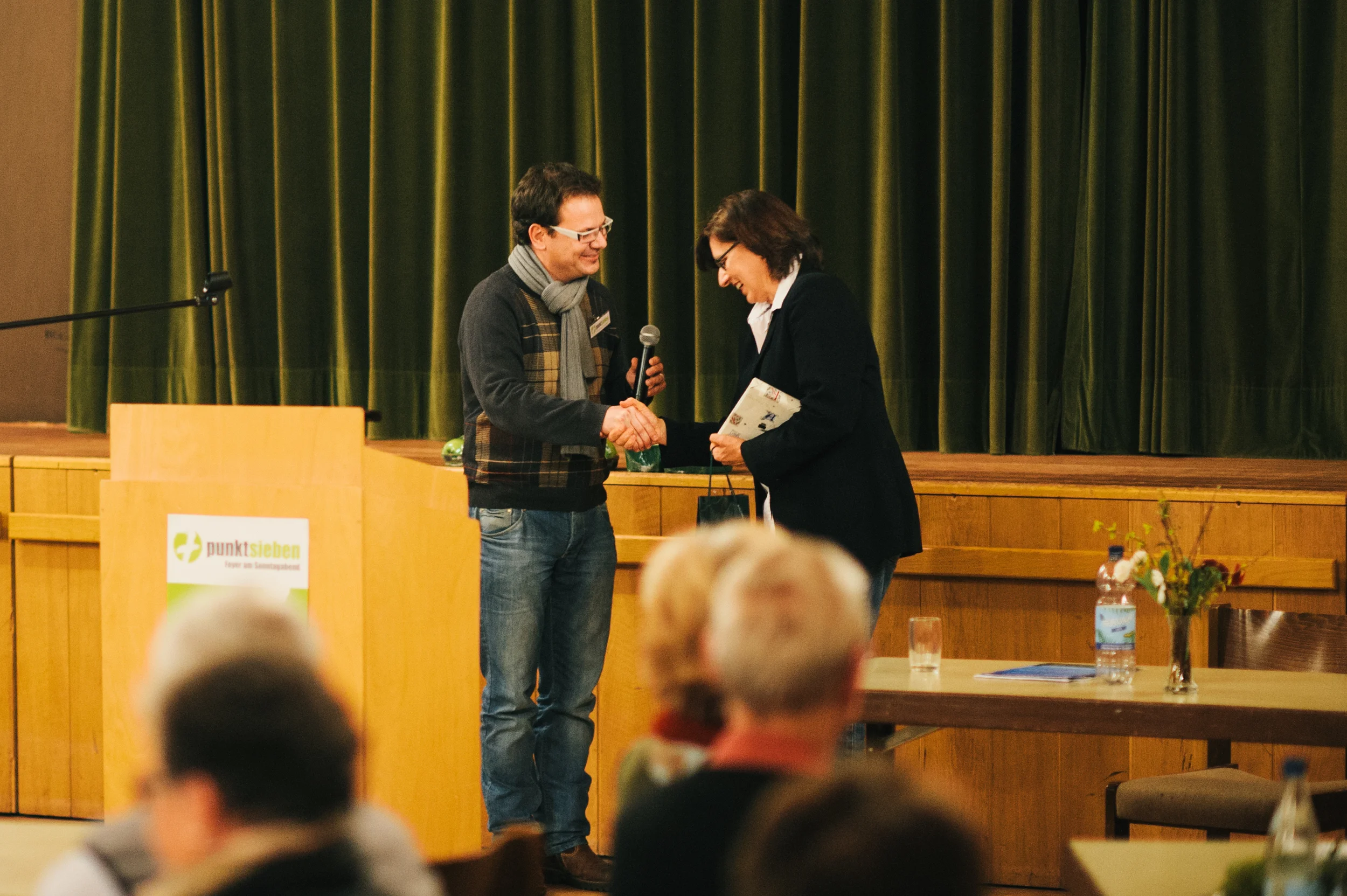 Ralf Tolle von Punktsieben moderierte den Abend, seine Teamkollegen Jochen Koppert, Sabine Reich und Matthias Kaiser stellten vertiefende Fragen. Da ging es unter anderem um „Billig-Bio“, Wege für Verbraucher, Druck auf die Hersteller auszuüben, die adäquate Förderung (nicht „mit der Gießkanne“) und einen „Blick in die Zukunft“, wenn eine kulturelle Veränderung sowohl Tierwohl und Umweltschutz als auch menschlicher Gesundheit entgegenkommt. Weniger oder gar kein Fleischkonsum wurden als ein guter Weg angesehen, die geschilderten Probleme zu mildern. In der Diskussion wurden auch Beispiele von erfolgreichen Bio-Betrieben genannt, die teils durch Vereine oder Genossenschaften gestützt werden. Weitere Themen waren verarbeitete Bioprodukte wie „Bio-Pizza“ („vermutlich zu viel Fett und Zucker“) und die Risiken des Freihandelsabkommens mit den USA.