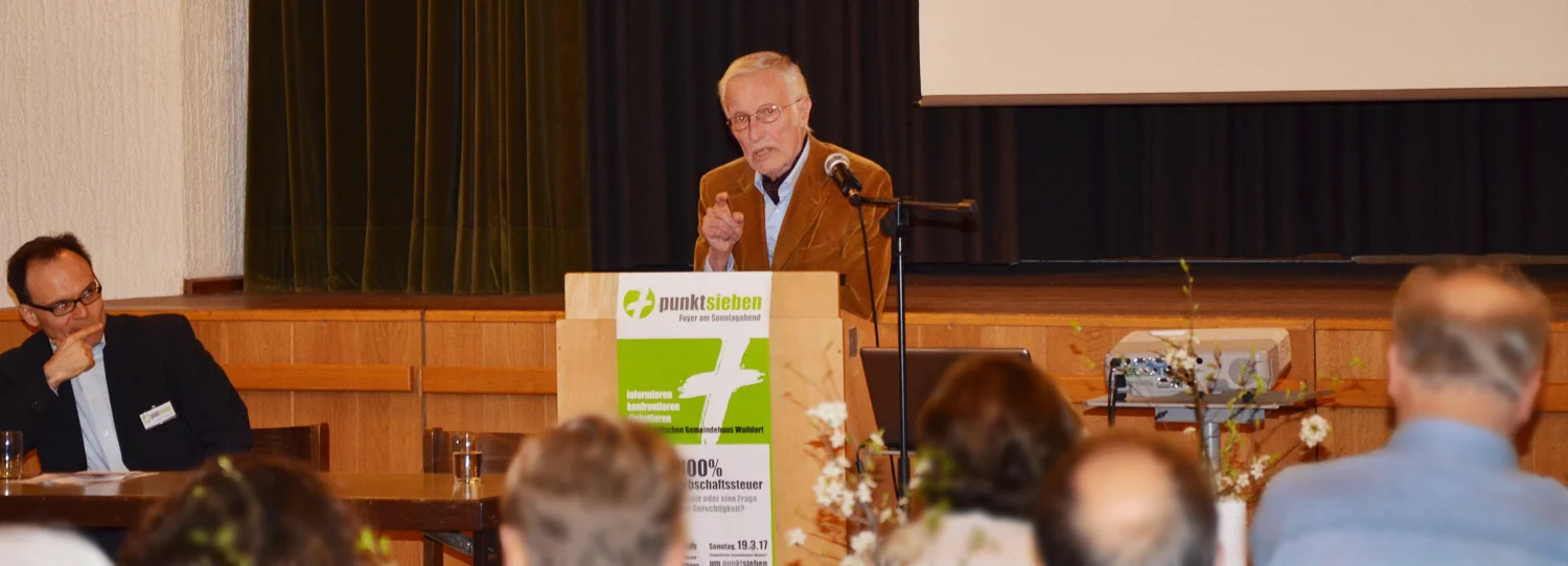 Der Wirtschafts- und Sozialwissenschaftler erntete viel Widerspruch in der kontroversen Diskussion mit den Besuchern bei „Punktsieben“, dem Diskussionsforum der evangelischen Kirchengemeinde Walldorf. Die Punktsieben-Mitglieder konfrontierten Kirsch auch mit anonymisierten Stellungnahmen, die im Vorfeld per E-Mail zugesandt worden waren und seinen Vorschlag rundweg ablehnten.